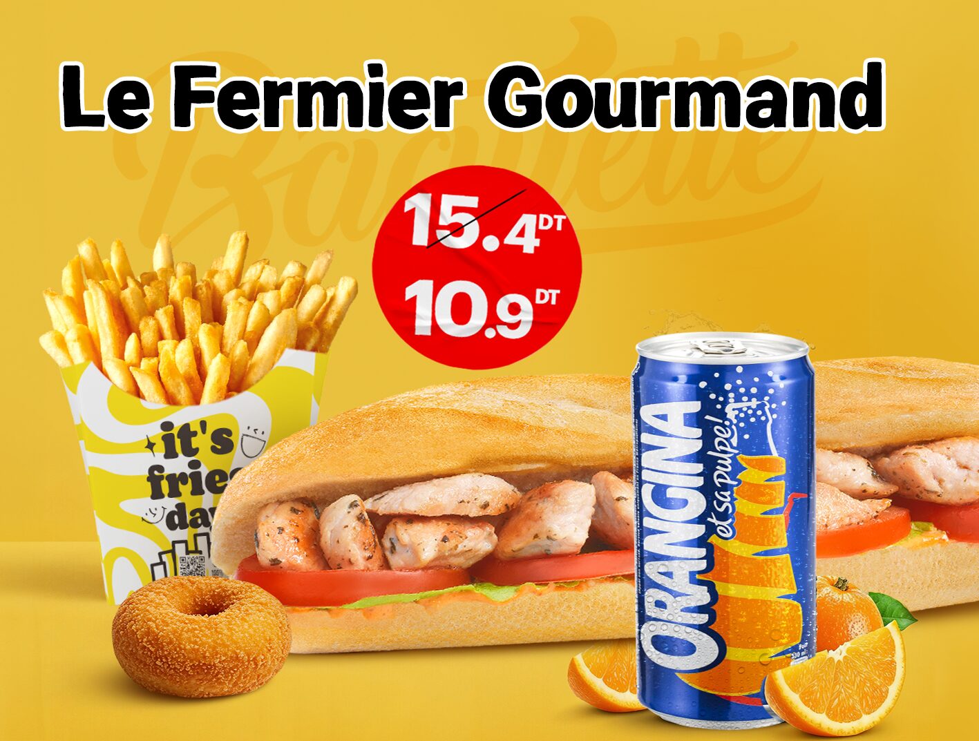 Baguette Box est composé : 4 sandwichs normaux au choix ( cordon bleu, zinger, tunisien, chicken burger, beef burger, fermier ) + 1 frite Family + 1 soda 1 L